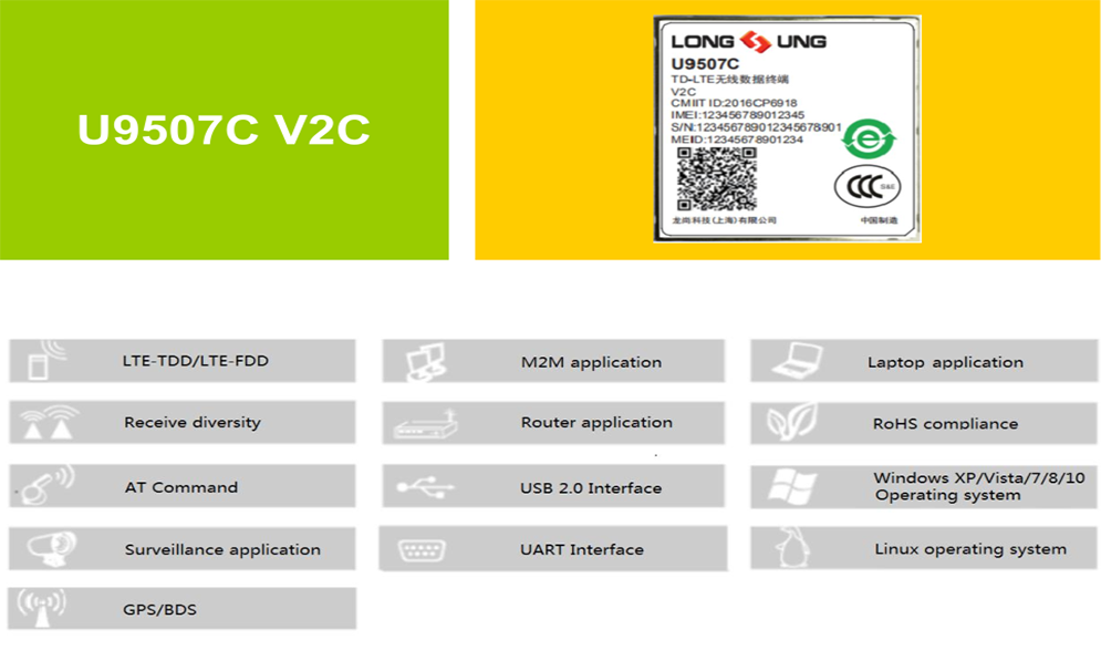 U9507C V2C 除了给予高速数据接入,还给予短信、彩信、电话薄、语音通话等功能,并能够被用在路由 器、DTU、CPE、车载设备、数据卡、移动互联设备等多个领域。